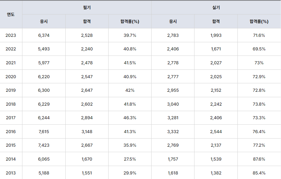 또한 2023년도 기준 필기시험을 남녀 응시자는 남성 6,241명, 여성 84명으로 여성은 거의 응시하지 않는 시험으로 볼 수 있습니다.